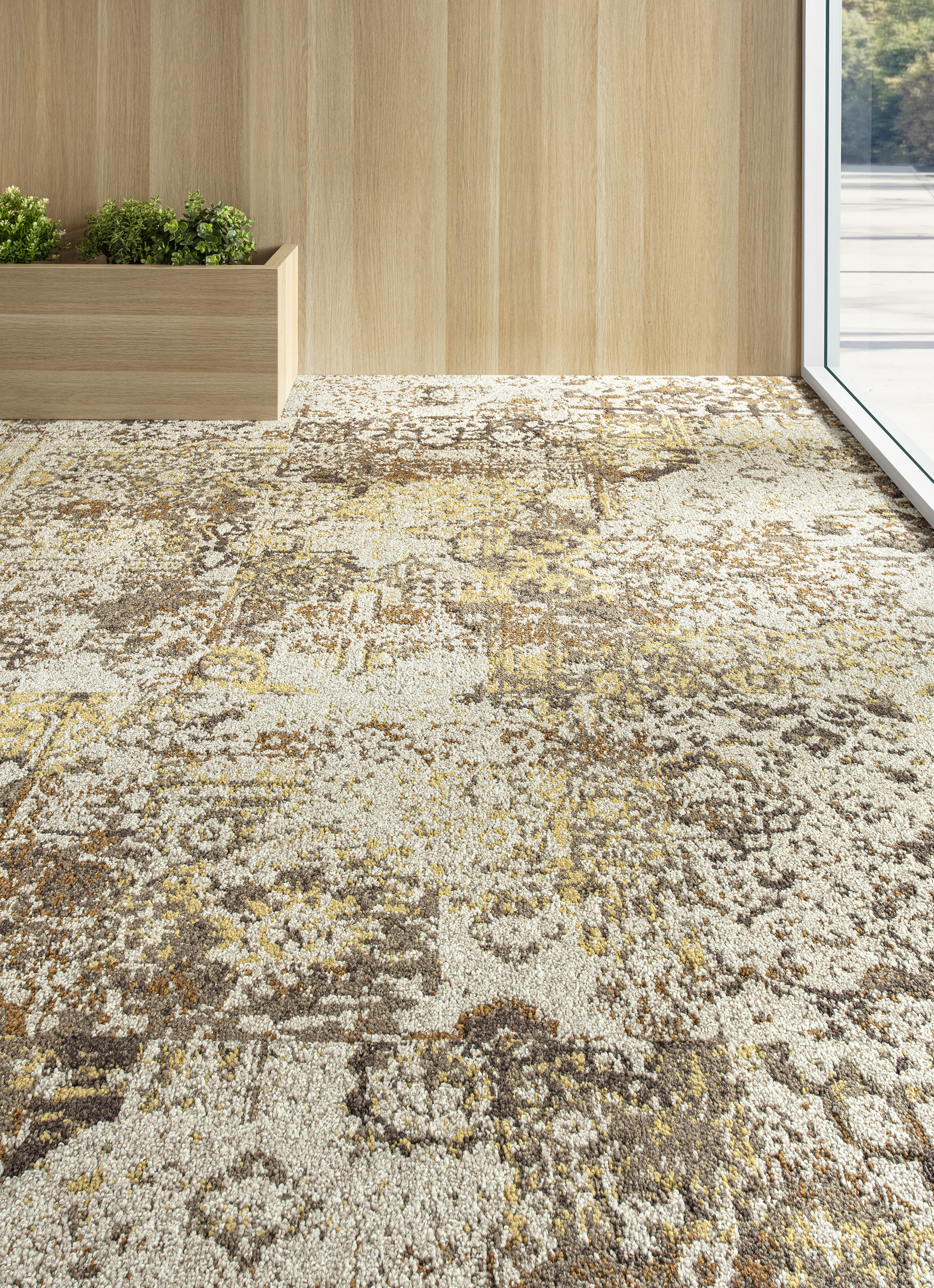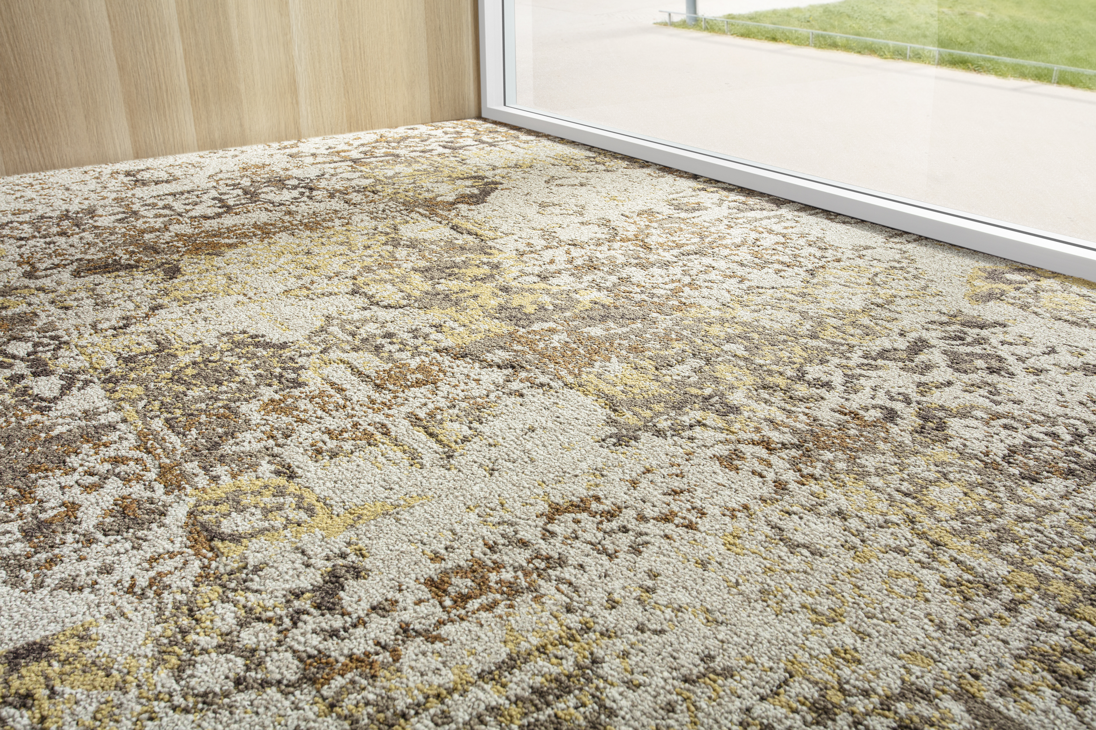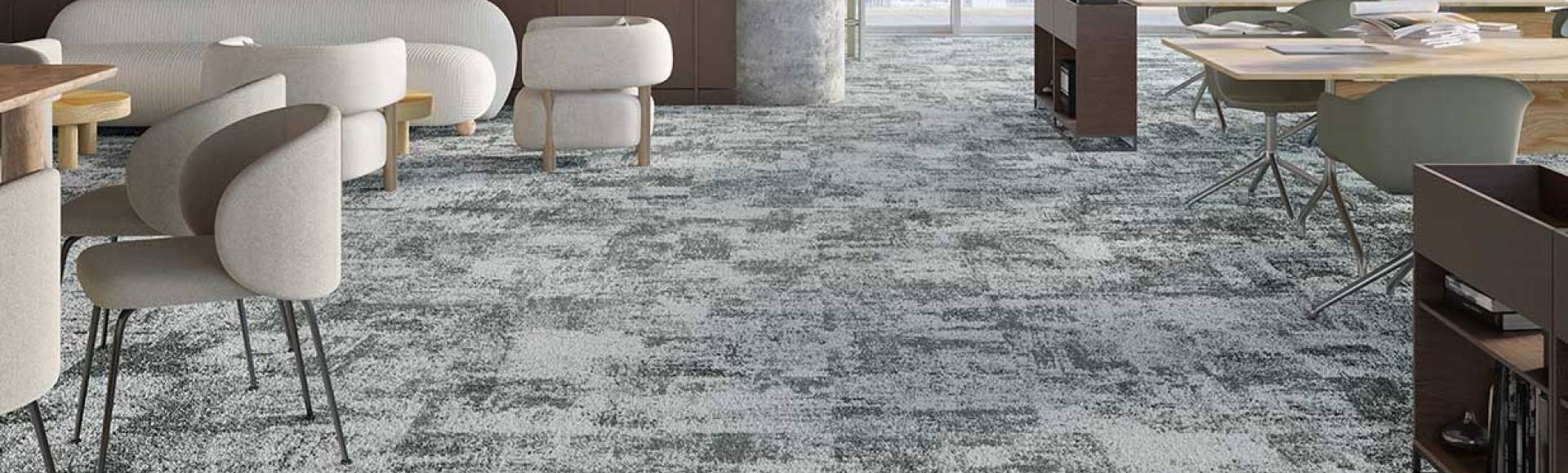Ab 2000 m²: kombinieren Sie mehrere Teppichdesigns in allen drei Formaten — 50 × 50 Fliesen, große 1 × 1 m Fliesen und 4 m Bahnenware — für einen harmonischen, maßgeschneiderten Boden