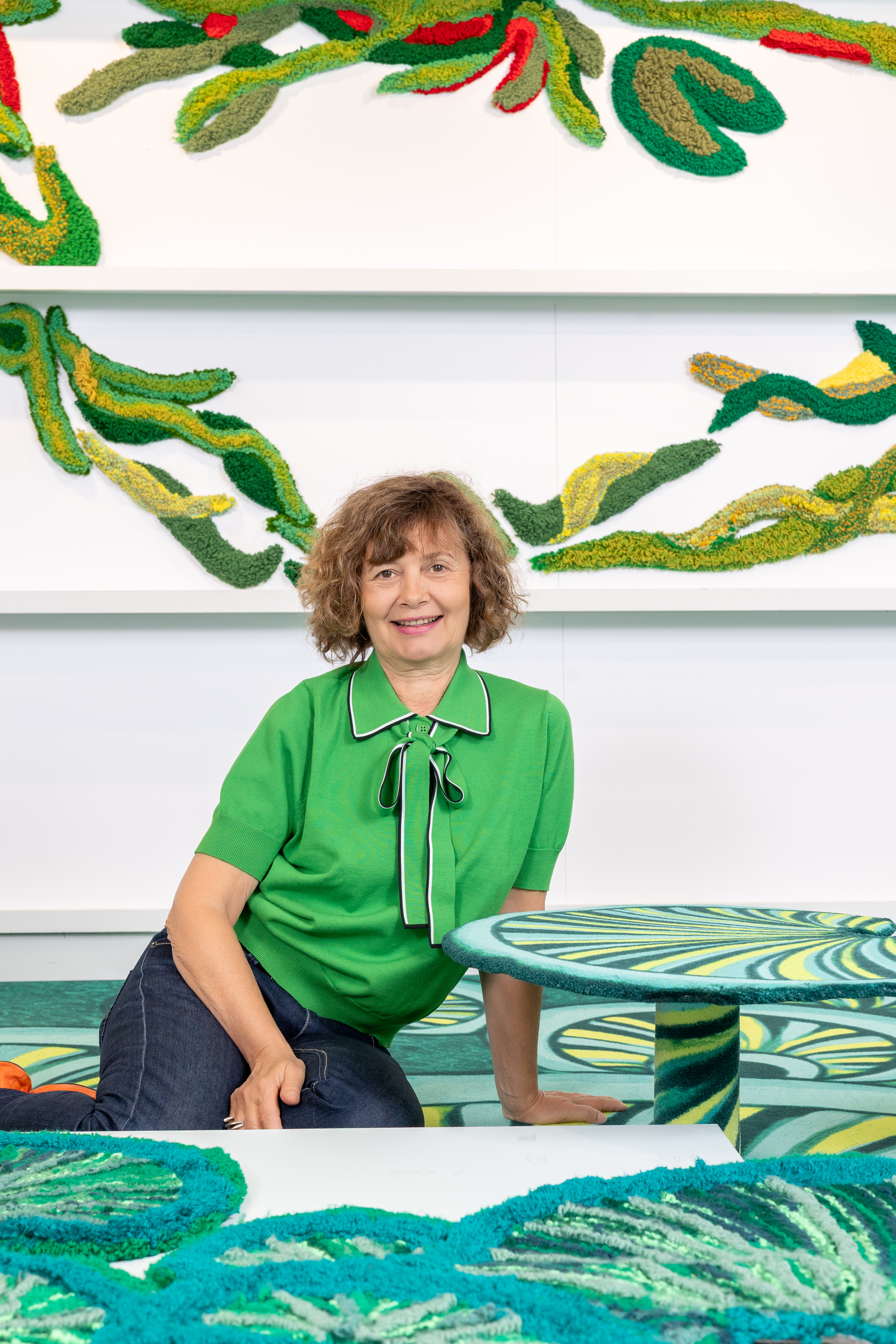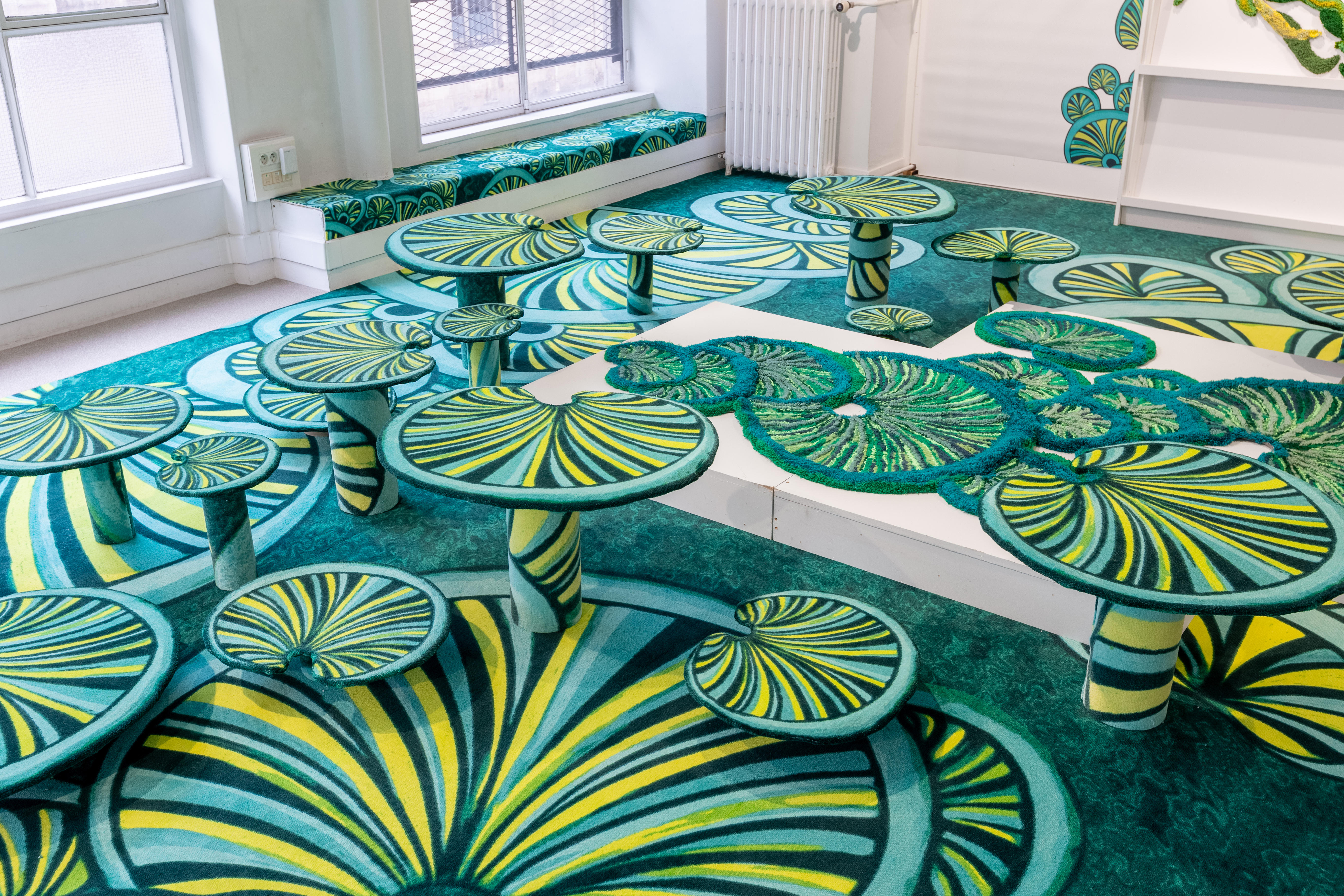 Auf dem Boden entfalten sich farbenfrohe Seerosen aus dem Funky Fungus-Universum in sattem Grün mit neon-gelben Akzenten, die an geheimnisvolle Wasserwellen erinnern. Einige erheben sich plastisch, während an den Wänden die „Folles grimpantes“ wie textile Lianen emporwachsen und dem Raum organische Vitalität verleihen. Im Dialog dazu schafft die Bilderserie Arrières pensées eine sensible Verbindung zwischen Malerei und Textilmaterial.