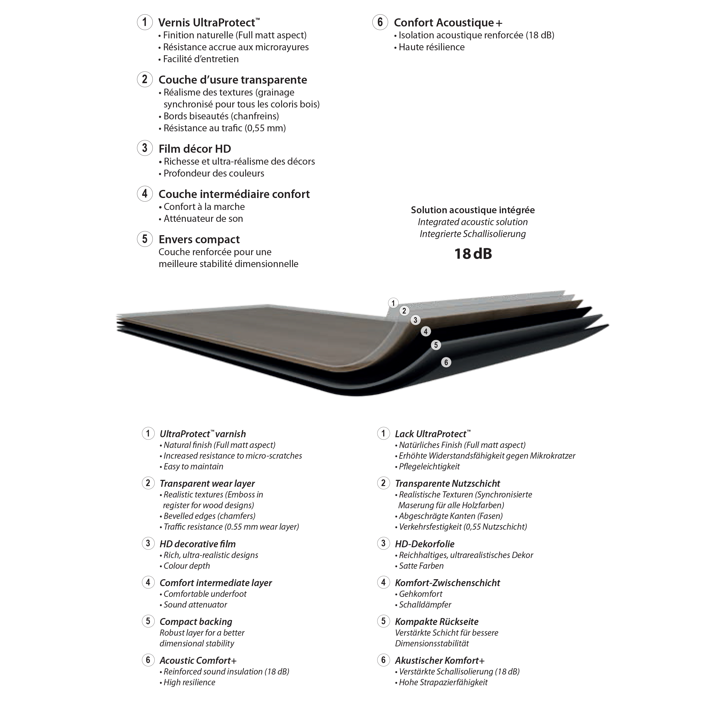 Durch die vernetzte Polyurethan-Oberflächenbehandlung (UltraProtect) wird seine Pflege erleichtert und seine Widerstandsfähigkeit gegen Mikrokratzer erhöht und er ist während seiner gesamten Lebensdauer geschützt.